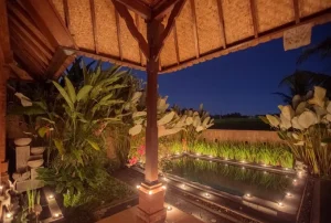 Villa dikelilingi dan persawahan yang menghadirkan suasana sejuk, cocok untuk bersantai.